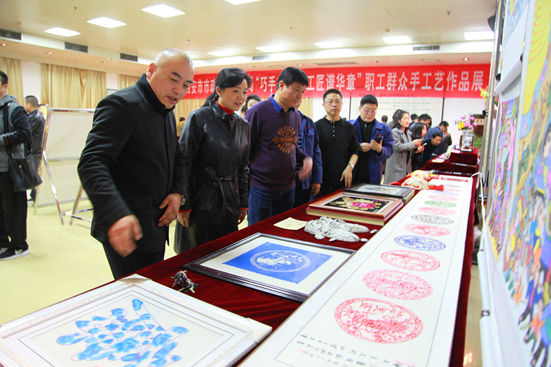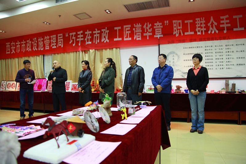 在党的十九届三中全会胜利召开之际,3月5日上午,西安市市政设施管理局“巧手在市政 工匠谱华章”职工群众手工艺作品展开幕式正式举行,市政公用局副巡视员常慧萍同志、组织人事处副处长吴艳华同志、陕西省农民画协会主席雷新宏先生莅临指导。